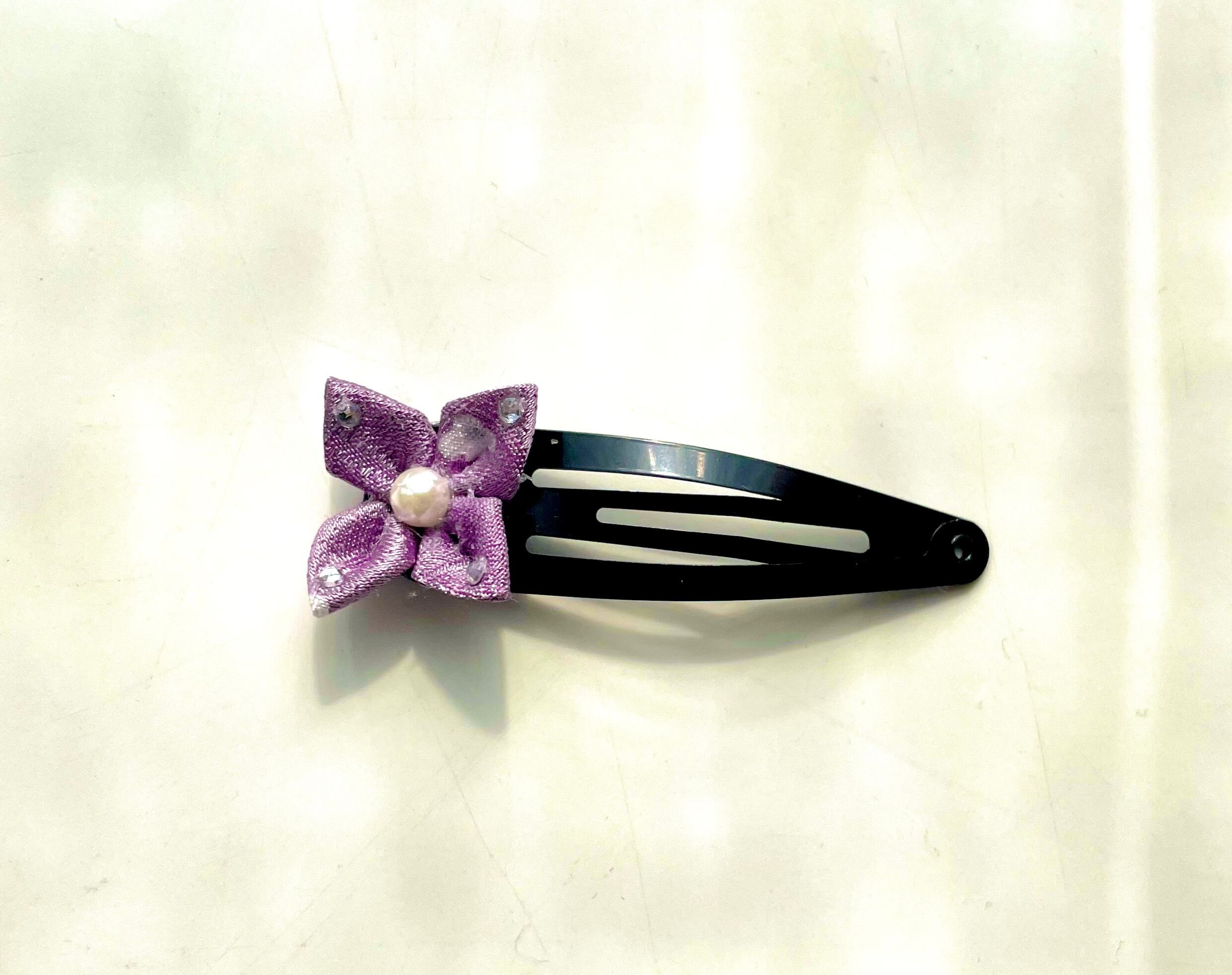 藤色のつまみ細工の花をあしらったぱっちんタイプのヘアピンです。